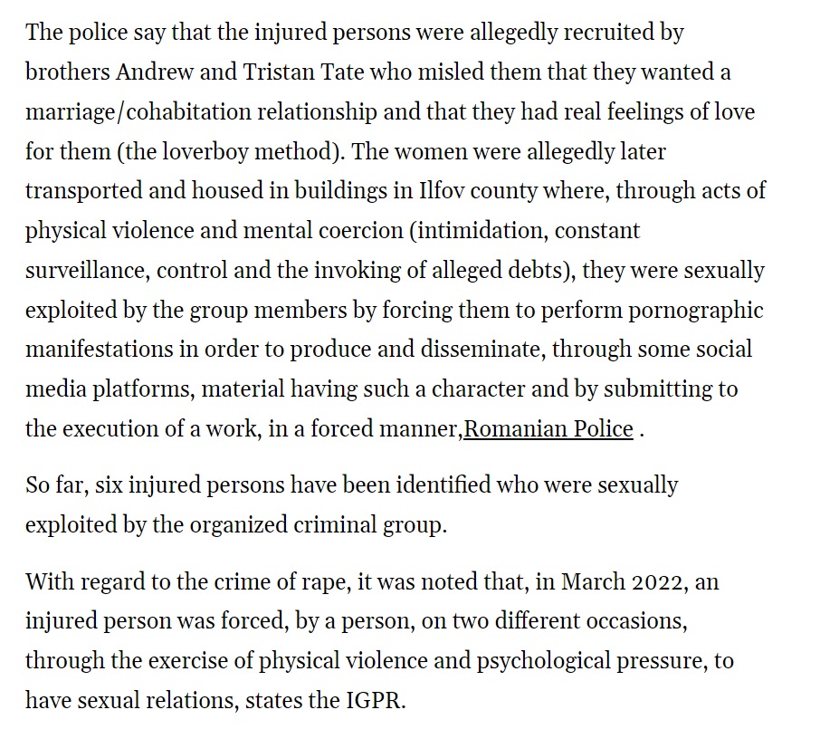 The report from Romania TV states that the Tate brothers are being treated as an organized crime group by the Romanian police and are facing serious accusations.