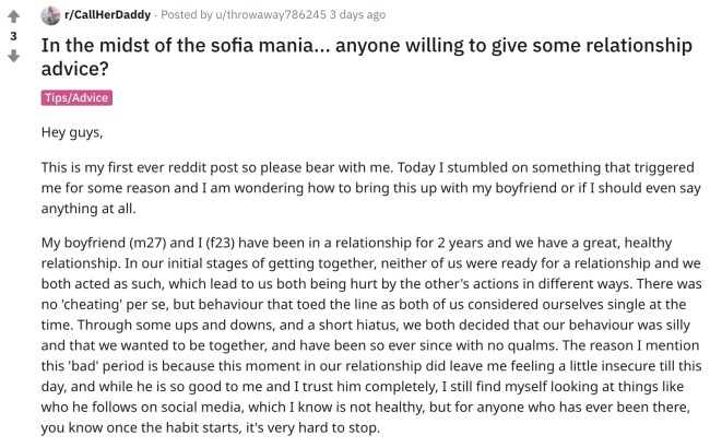 Last week, I dove into the Call Her Daddy subreddit. Within its turbulent waters, you’ll find the occasional plea for advice on a fan’s personal dating issue. These are the treasures I seek, and this week we’ve got a doozy that centers around the age-old problem of a boyfriend following Instagram thots. For the full thread with responses, click here. Otherwise come on in, the water’s fine: