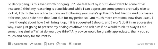 So daddy gang, is this even worth bringing up? I do feel hurt by it but I don’t want to come off as insecure, I think my reasoning is plausible and while I can appreciate some people are really nice to look at, I think there is a line to draw, and following your mate’s girlfriend’s hot friends kind of crosses it for me. Just a side note that I am due for my period so I am much more emotional now than usual. I have thought about how I will bring it up, if it is suggested I should, and I won’t do it in an aggressive way, I was just going to present my analogies above and ask him if he would think its okay if I did something similar? What do you guys think? Any advice would be greatly appreciated, thank you so much and sorry for the rant xx