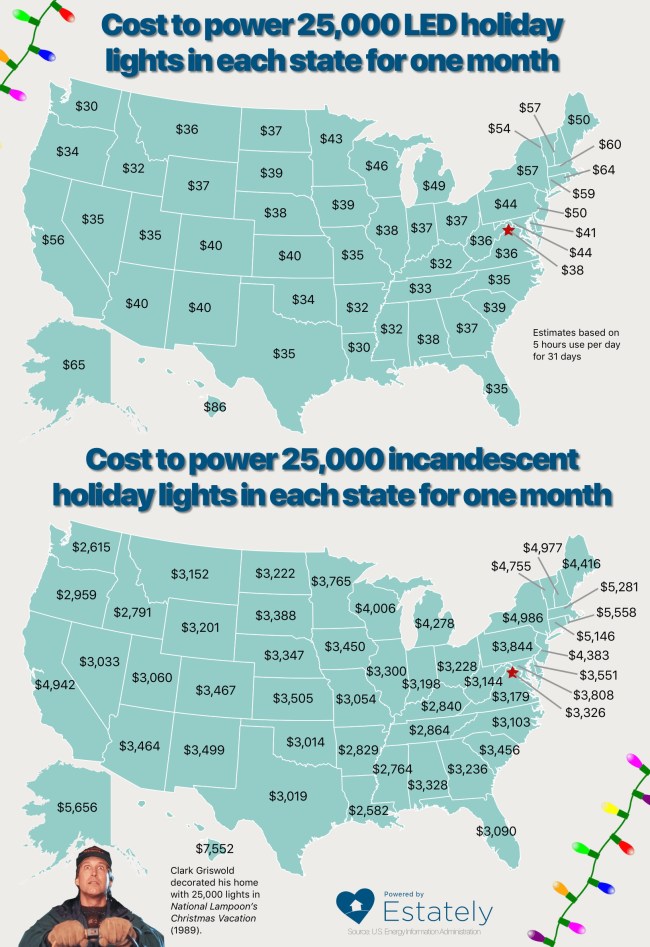 As a Food Preserver by trade, Griswold may have been stretching his wallet thin with this festive display, citing data from the U.S. Energy Information Administration. Using this data, the folks at Estately calculated the cost of both incandescent and LED holiday lights.