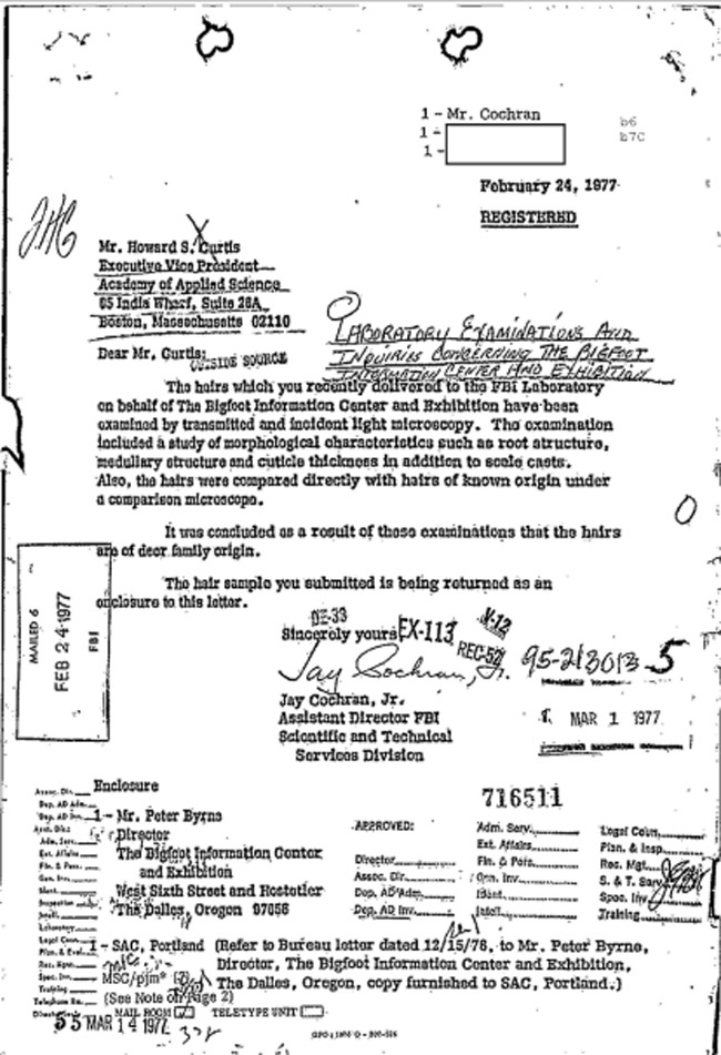 Several months of correspondence later, the FBI finally revealed to Byrne and the Academy of Applied Science that the hairs were tested and were determined not to be Bigfoot in origin.