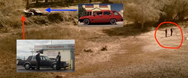 We then get an overhead view from this very desert that appears to show two people standing next to the El Camino.