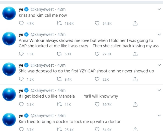 On Monday night, Kanye took to Twitter to post several bizarre tweets in which he claims Kim Kardashian and Kris Jenner are trying to “lock him up.”