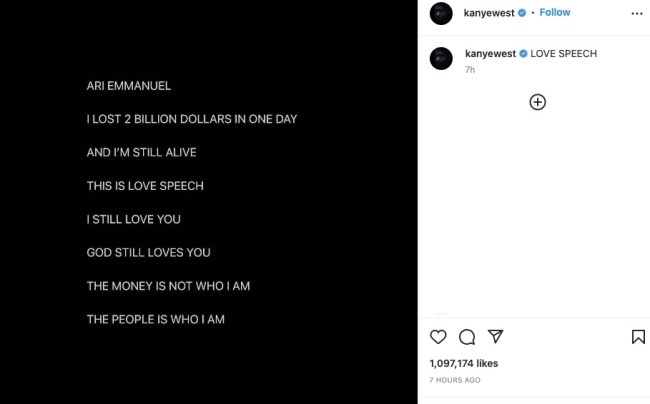 “Ari Emanuel. I lost 2 billion dollars in one day. And I’m still alive. This is love speech. I still love you. God still loves you. The money is not who I am. The people is who I am,” West wrote on Instagram.