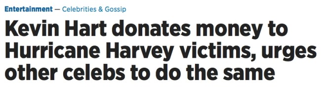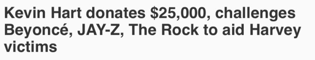 Hart gave up 1/5,120 of his net worth to Hurricane Harvey relief efforts. Business Insider lists the median net worth of the average American of Hart’s age (38) to be $35,000. So, Hart’s donation is the equivalent of an average American donating $6.80 to relief efforts. How many of your Instagram followers have made a video patting themselves on the back for a six fucking dollar donation? How many articles were writing about their good deed? Oh, zero?