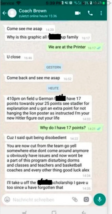 In the screenshot, Coach Brown appears to text the student in question, Alexandros Alexiou, telling him to come see him because he had 17 disciplinary points of 25 for being “disobedient.” Players can earn points for an array of reasons–fighting, tardiness, academic missteps–and when they hit 25, they get kicked off the team and their scholarship pulled.