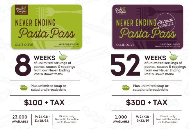 Every year since 2015, Olive Garden has offered faithful patrons the opportunity to purchase a Pasta Pass. The Annual Pasta Pass entitles the owner to overindulge in 52 weeks of unlimited servings of 100 possible combinations of Olive Garden’s never-ending Pasta Bowls, their favorite pastas, homemade sauces, and toppings, PLUS unlimited soup or salad and breadsticks.