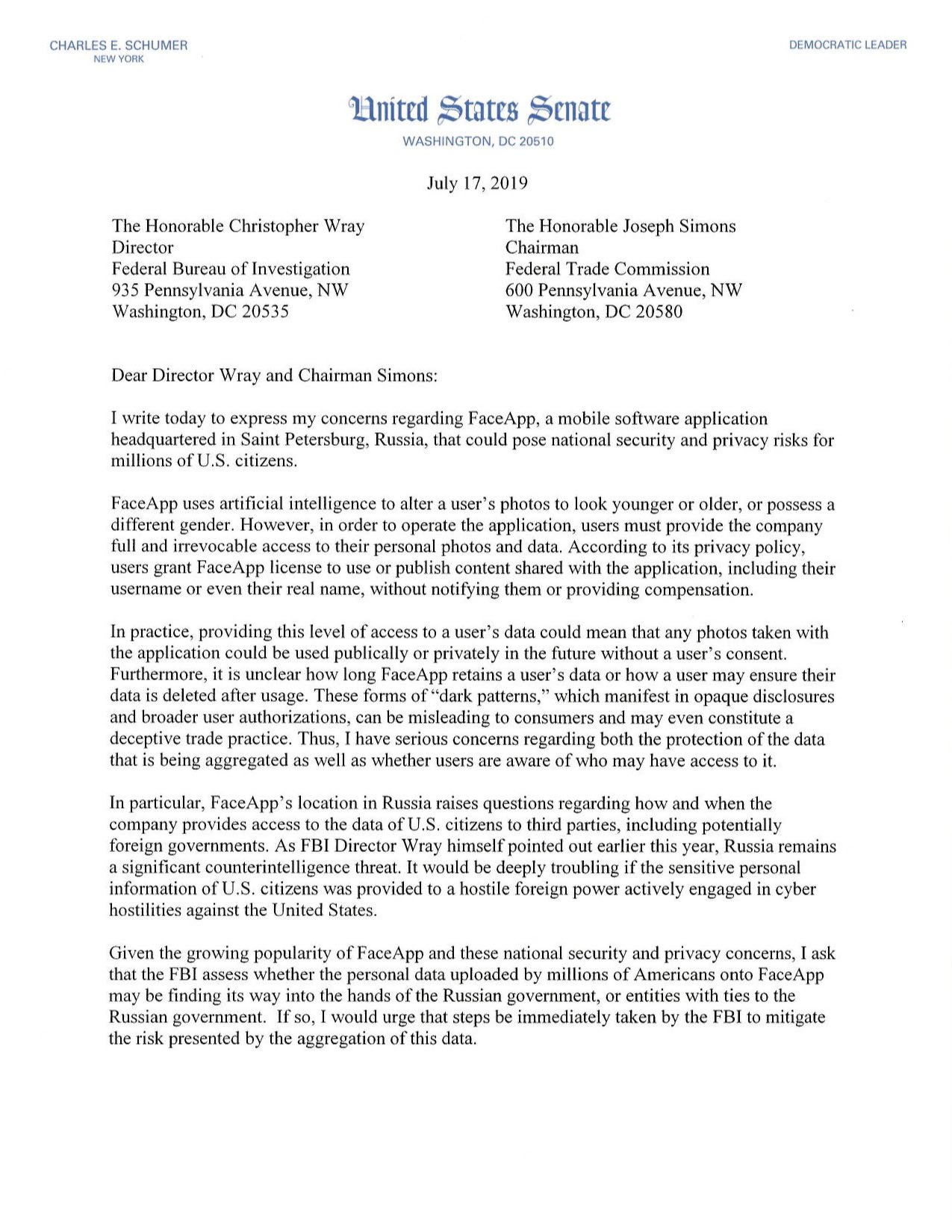 Mr Schumer however has asked that the FBI and the Federal Trade Commission (FTC) to investigate FaceApp.“I have serious concerns regarding both the protection of the data that is being aggregated as well as whether users are aware of who may have access to it,” his letter reads.