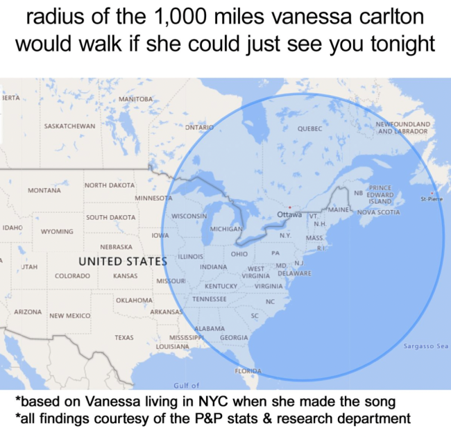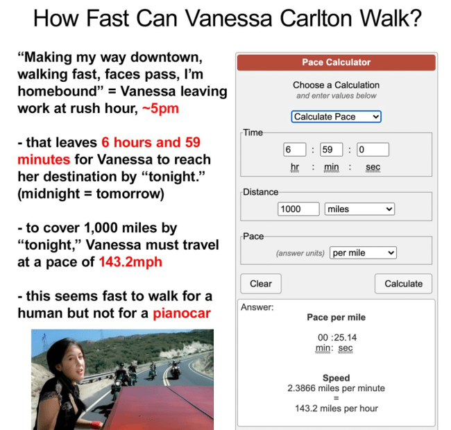 So in Vanessa Carlton’s breakthrough 2001 hit, “A Thousand Miles”, she clearly is bargaining with fate regarding her love interest saying, “You know I’d walk a thousand miles if I could just see you tonight.” But she ignores the obvious fact that it is physically impossible to walk a thousand miles and still see someone that same night.