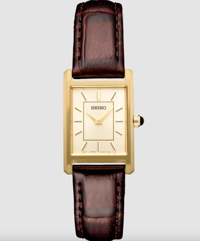 Your mom already has a smartwatch that does it all. Go analog with a classic Seiko, featuring a light champagne rectangular case with a gold finish and a brown leather strap.