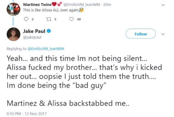 Jake is referring to his ex, Alissa Violet (pics in a bit), who he met at a fan meet-and-greet and signed her to a five year contract with Team 10. Rookie move. The two apparently broke up and Jake kicked her out of his mansion for reasons that were not made public until the other night. Alissa’s story was a bit different.