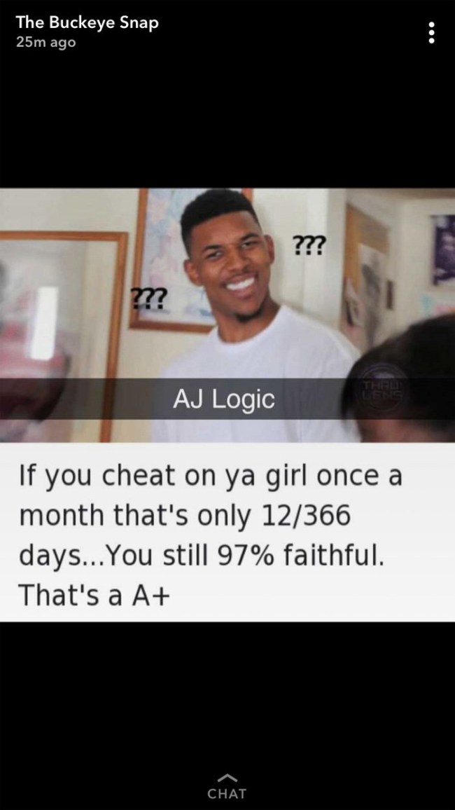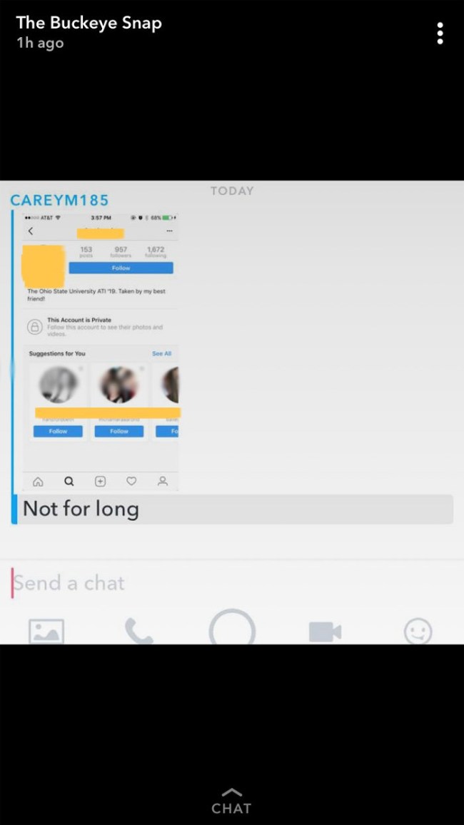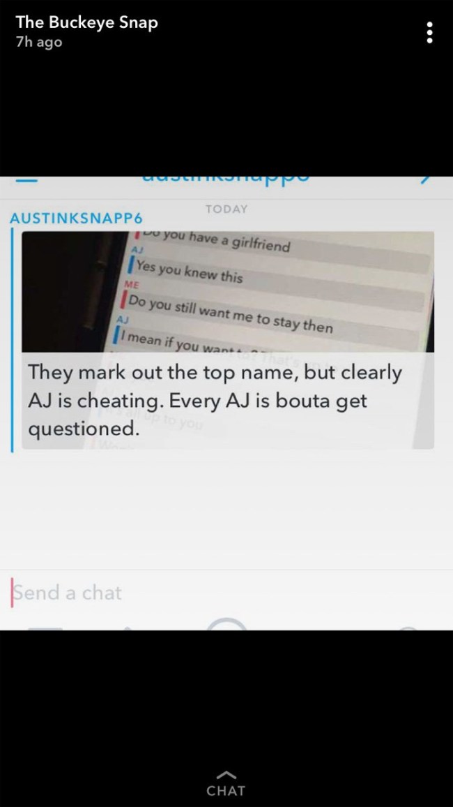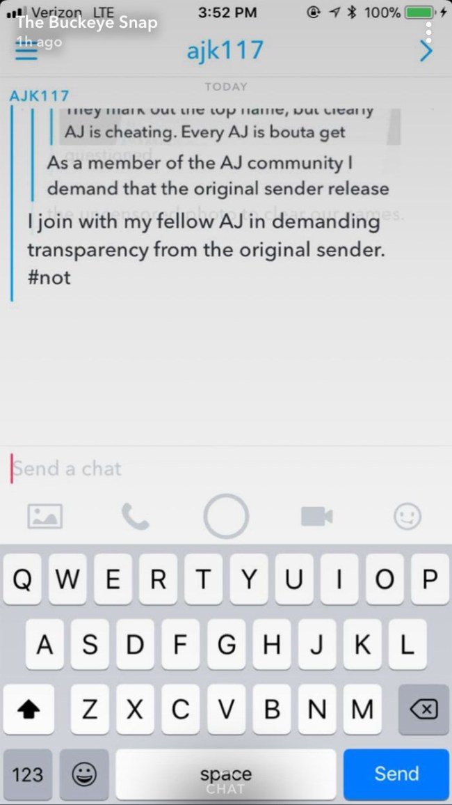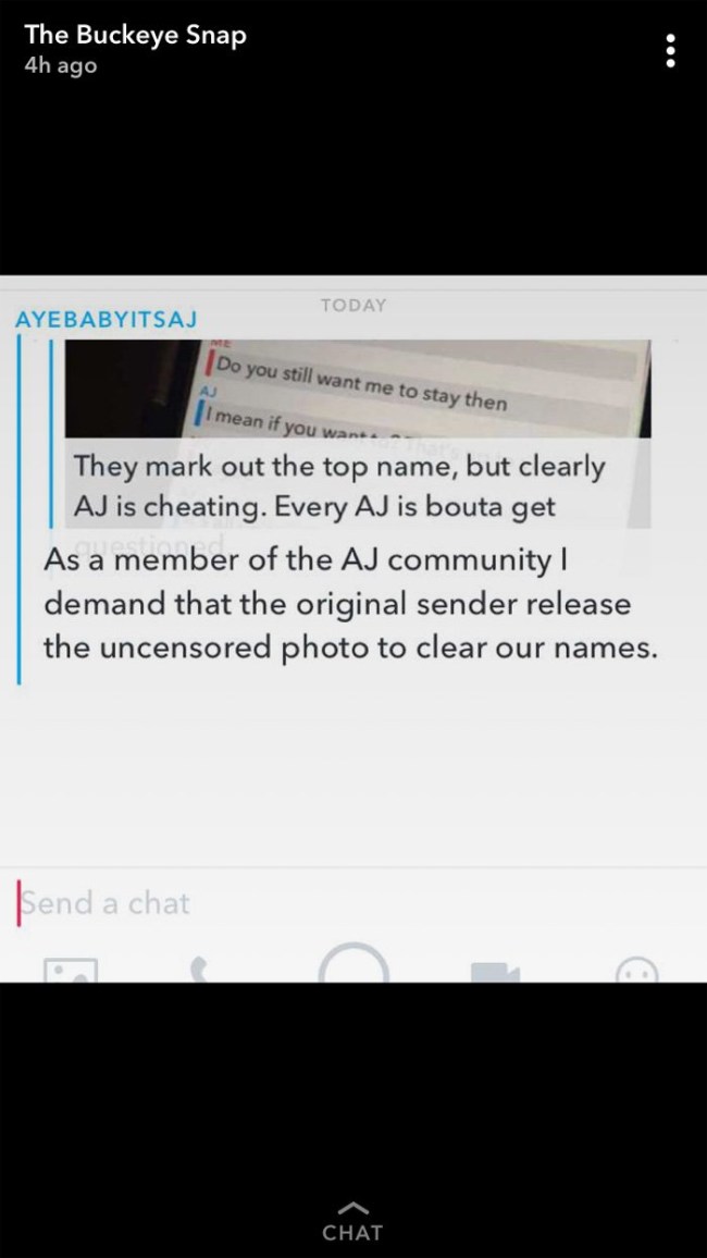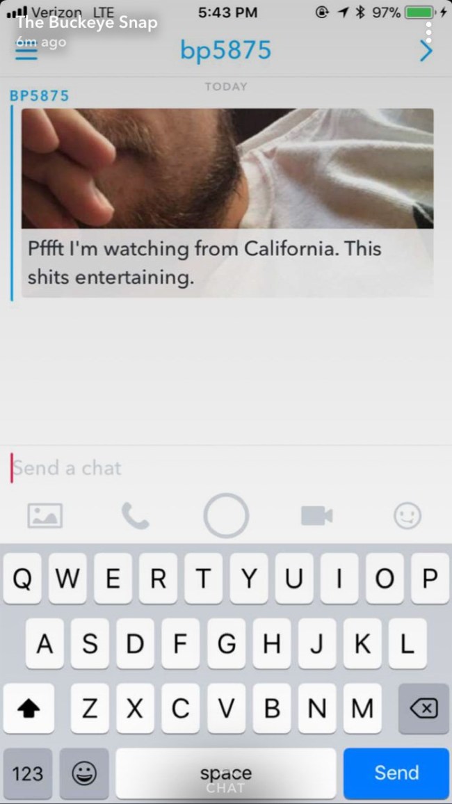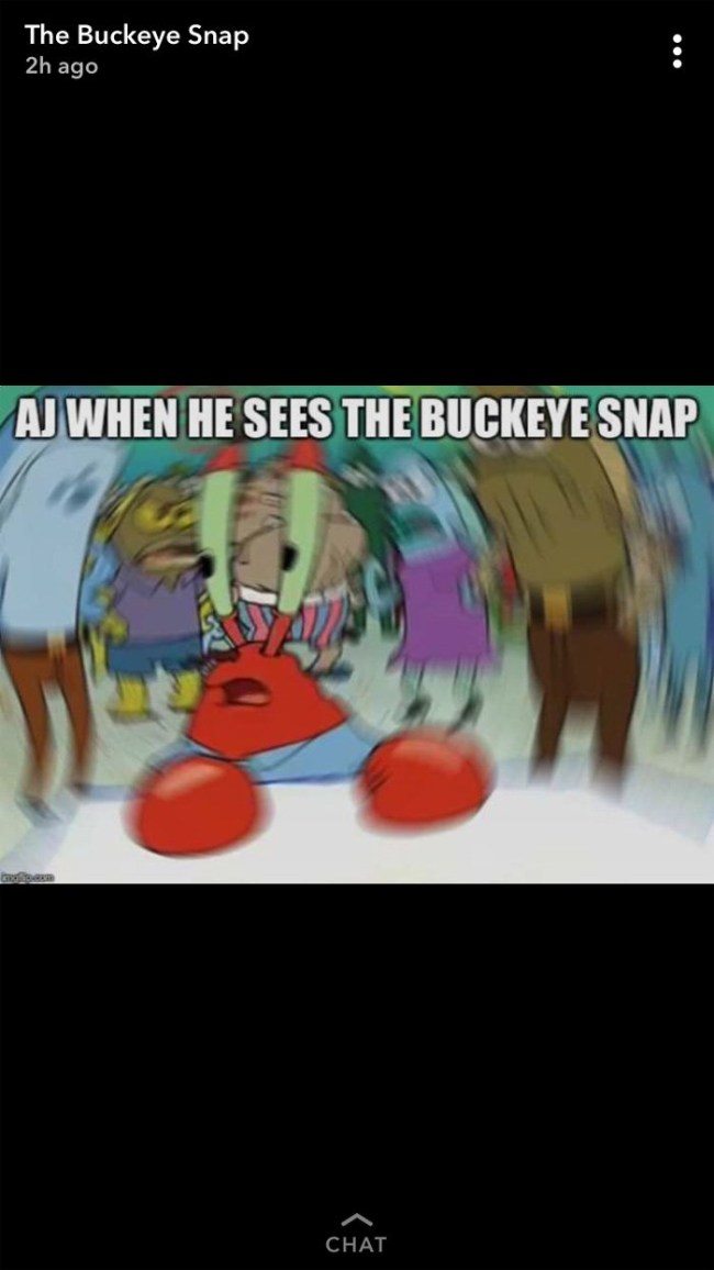 Case in point: This dude named AJ getting outed by his school, Ohio State’s, Snapchat feed. Apparently students can now send photos to their school’s Snapchat feed, ranging from appropriate scholarly photos to a butt chug.