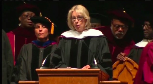 Well, that same scene was reenacted by Education Secretary Betsy DeVos as she gave the keynote address at Bethune-Cookman University’s commencement Wednesday afternoon. She didn’t shit herself, well, that we know of, but she was forced to perform under the most humiliating of circumstances.