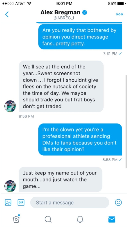 Bregman took a different route–sliding in a male fan’s DMs to berate him about his baseball opinions.