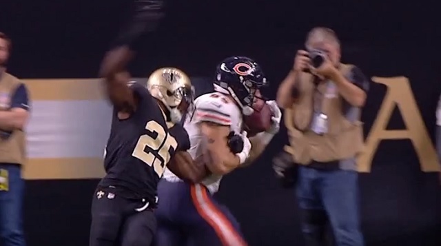 In the third quarter of today’s Bears-Saints game, Bears tight end Zach Miller went to make a catch in the end zone when his leg snapped in half. Despite the injury, Miller held on to the ball but for whatever reason refs didn’t feel he had possession for long enough
