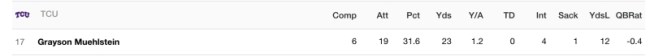 Look at this stat line by TCU quarterback Grayson Muehlstein. This is not a typo.