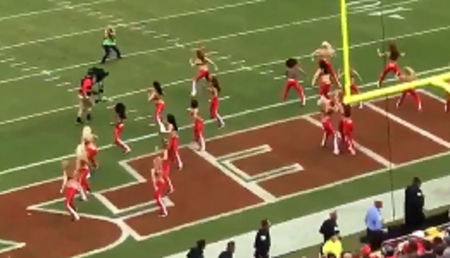 Gotta keep your head on a swivel whenever you’re on a football field even if you’re a cheerleader.
