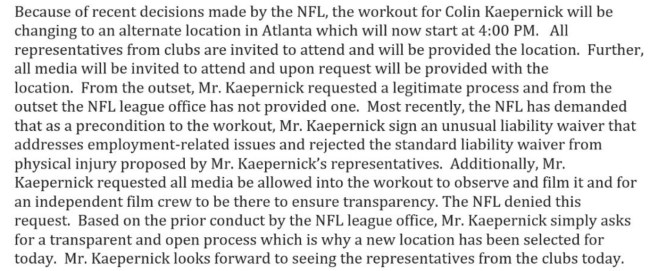Colin Kaepernick’s workout at the Falcons’ training facility at 3 pm is off; his workout now will be at another Atlanta location at 4 pm today.