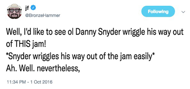 I’d like to see ol Danny Snyder wriggle his way out of this jam.