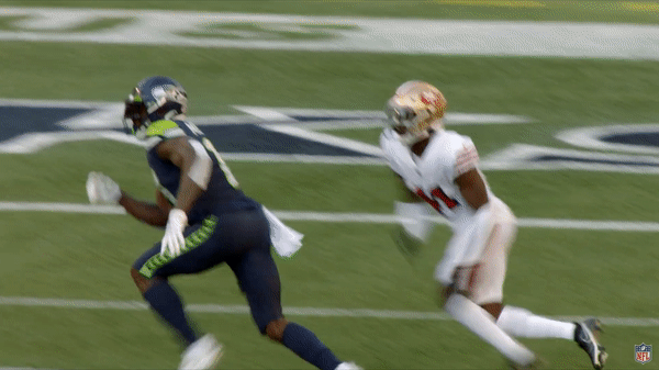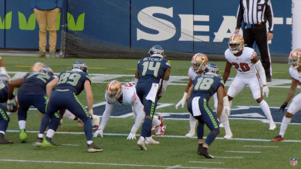 A few moments later, 49ers defensive back K’Waun Williams lines up across from Metcalf on the line of scrimmage. Williams is 5-foot-9, 185 pounds. He has a six-inch and 45-pound disadvantage to the man he is set up to guard. The play goes on the ground and Metcalf blocks him into the goal post.