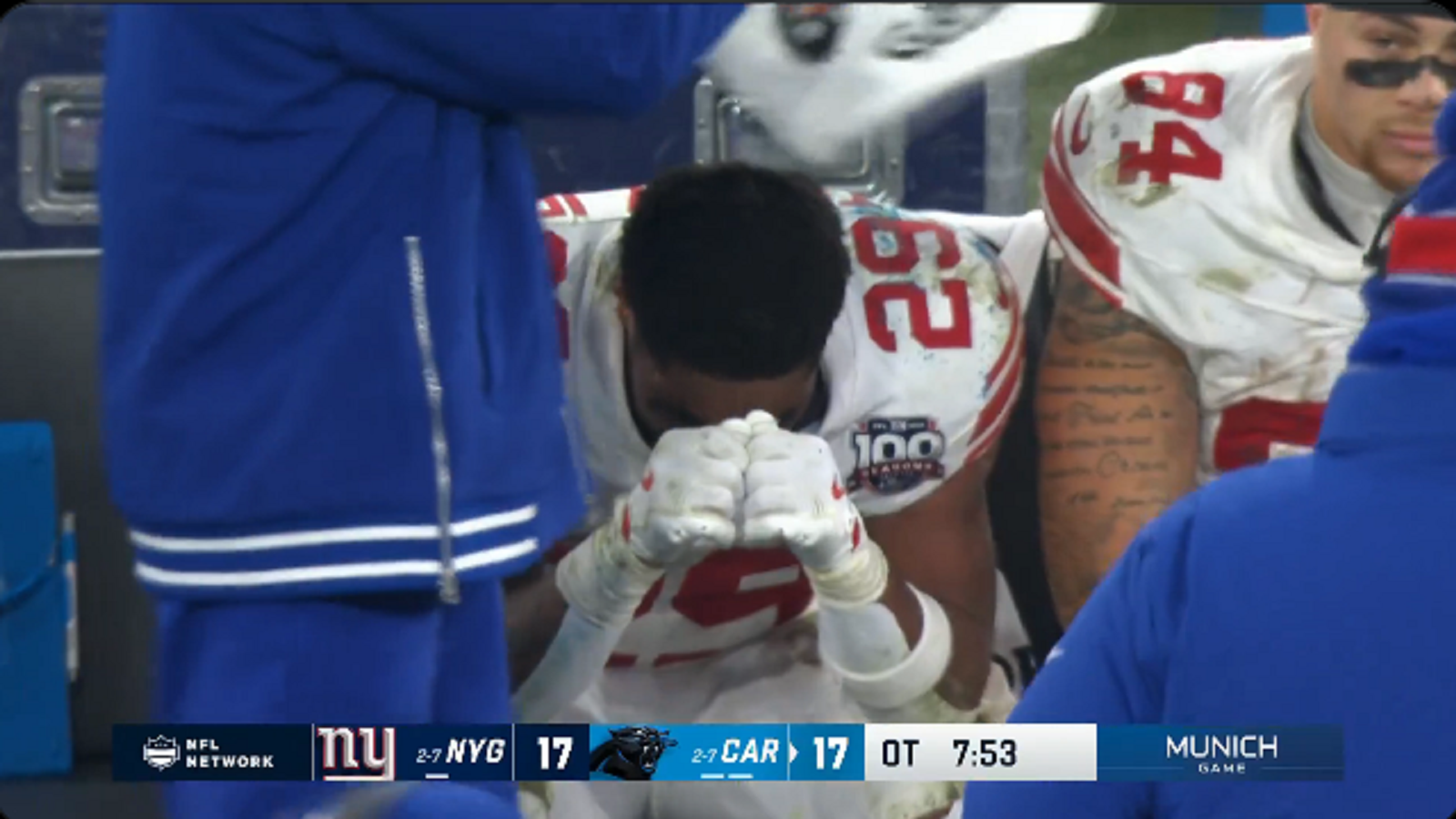 Heartbreaking: #Giants rookie standout running back Tyrone Tracy Jr. was in tears on the bench after fumbling in overtime.