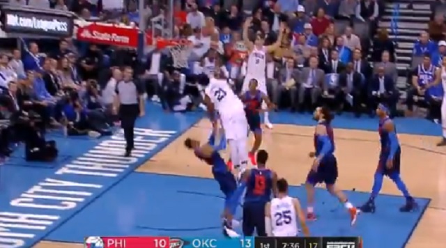 During the first quarter of their game on Sunday, Embiid threw down a poster dunk over the Oklahoma City Thunder guard, and stared him down as he ran back down the court.