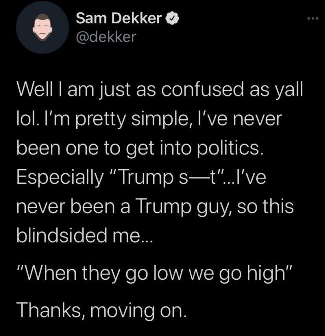 The same season the two were teammates, Dekker earned the temporary nickname DeKKKer after posting and deleting a tweet in response to former Wisconsin teammate Bronson Koenig tweeting an article titled “White People Have No Culture.” Dekker responded saying: “Don’t put it in my face that being a white guy is something I’m supposed to be ashamed of. Im proud of who I am and so should you.”