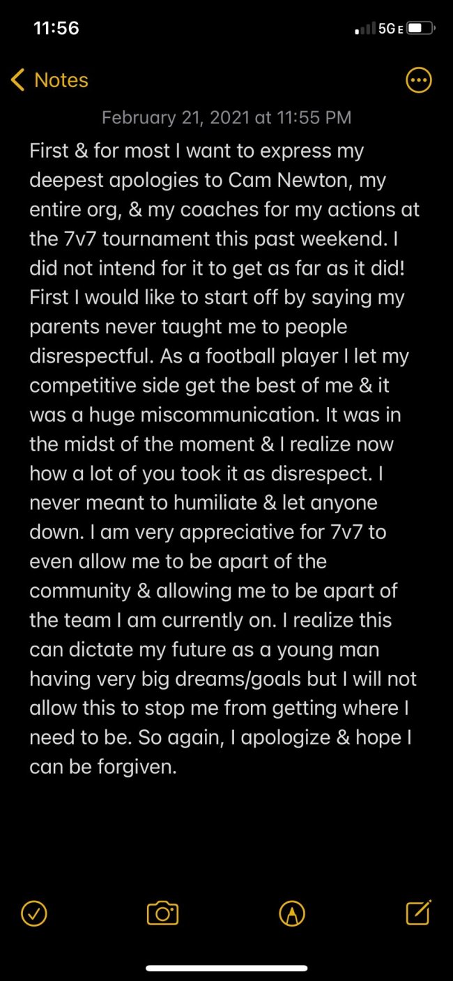 We already have an apology from the kid who thought it was a good idea to talk trash to Cam Newton.
