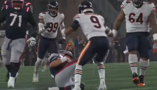 During Monday night’s Bears-Patriots game, Jones ran the ball, slid, and kicked Bears Jaquan Brisker in the nuts.