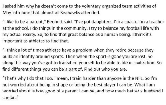 When Bennett was asked why he skips Seattle’s voluntary offseason workouts, his answer was transcendent.