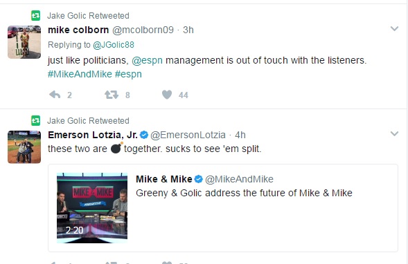 After today’s show, Mike Golic’s son, Jake, took to Twitter to rip ESPN for separating the duo.