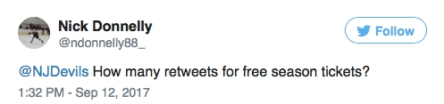 A New Jersey Devils fan named Nick Donnelly figured he’d shoot his shot with his favorite team by asking them how many retweets he’ll need for the organization to gift him season tickets.
