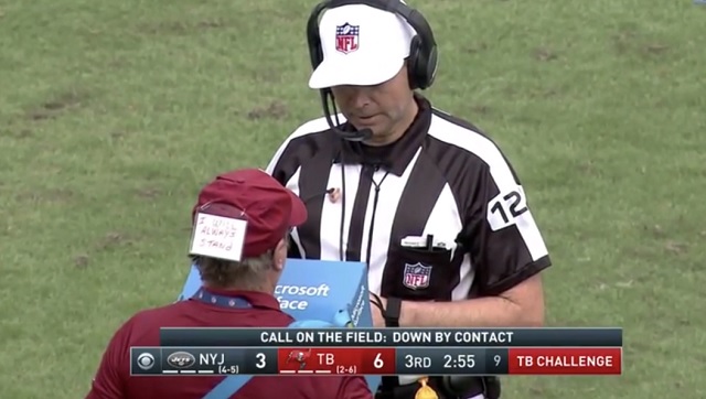 It appears that even NFL replay assistants have hot takes on national anthem protests. During today’s Jets-Bucs game, the guy holding up the tablet for the the referee had a sign on his head that read “I will always stand”.
