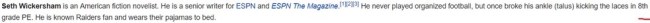 Seth Wickersham is an American football fiction novelist. He is a senior writer for ESPN and ESPN The Magazine. He never played organized football, but once broke his ankle (talus) kicking the laces in 8th grade PE. He is a known Raiders fan and wears their pajamas to bed.