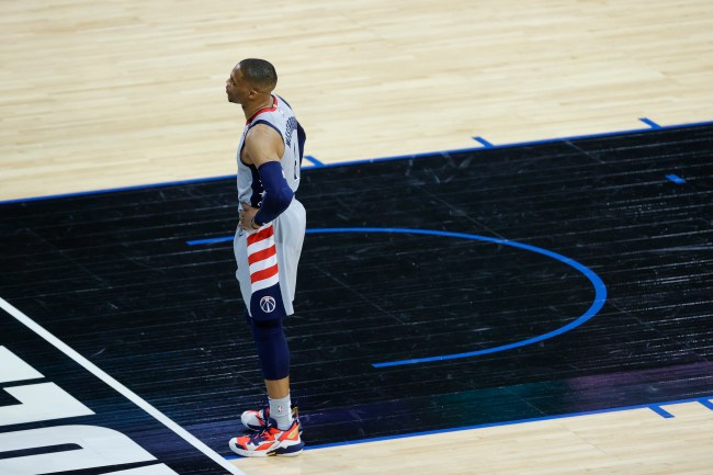 After Russell Westbrook suffered an ankle injury that sent him to the locker room in the 4th quarter of a Sixers 120-95 Game 2 win, a scumbag fan dumped popcorn on his head while entering the tunnel.