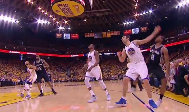 During today’s Western Conference finals game between the Spurs and the Warriors, Zaza Pachulia was involved in a controversial play when he closed out on a Kawhi Leonard three pointer and ended up stepping under the Spurs forward’s legs.