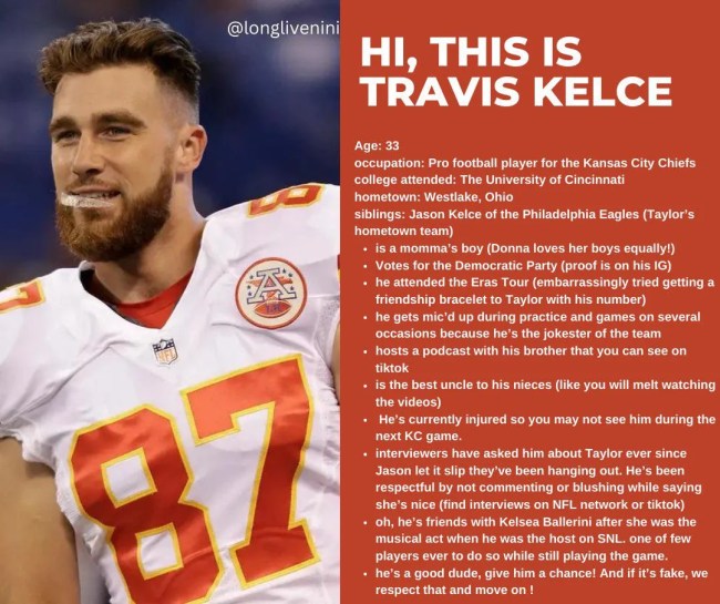 But, someone in the vast internet has made a handy infographic that fills Taylor Swift fans on just who the seven-time all-pro selection is. Take a look.