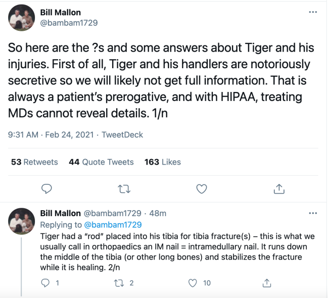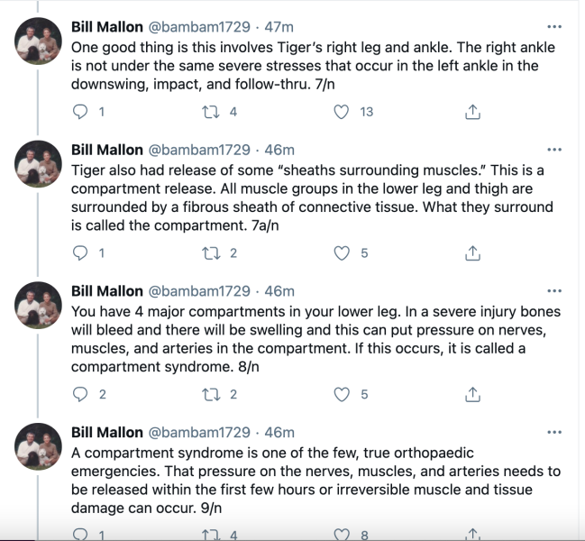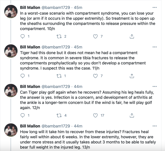After these details were shared on social media, Bill Mallon gave his opinion and analysis about Woods’ injuries, surgery, and what his recovery may look like. Mallon is a former PGA Tour player and now the Associate Consulting Professor of Orthopaedics at Duke University while also having his own practice.