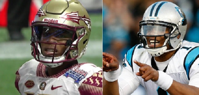 Florida State quarterback Deondre Francois and Cam Newton don’t look that much alike until Francois puts his helmet on on and you can barely tell him apart from the Panthers QB.