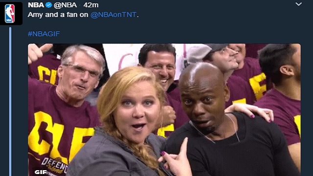 During tonight’s game 3 of the Eastern Conference finals between the Boston Celtics and the Cleveland Cavaliers, the NBA’s official Twitter account posted this GIF of Amy Schumer and Dave Chappelle at the game.